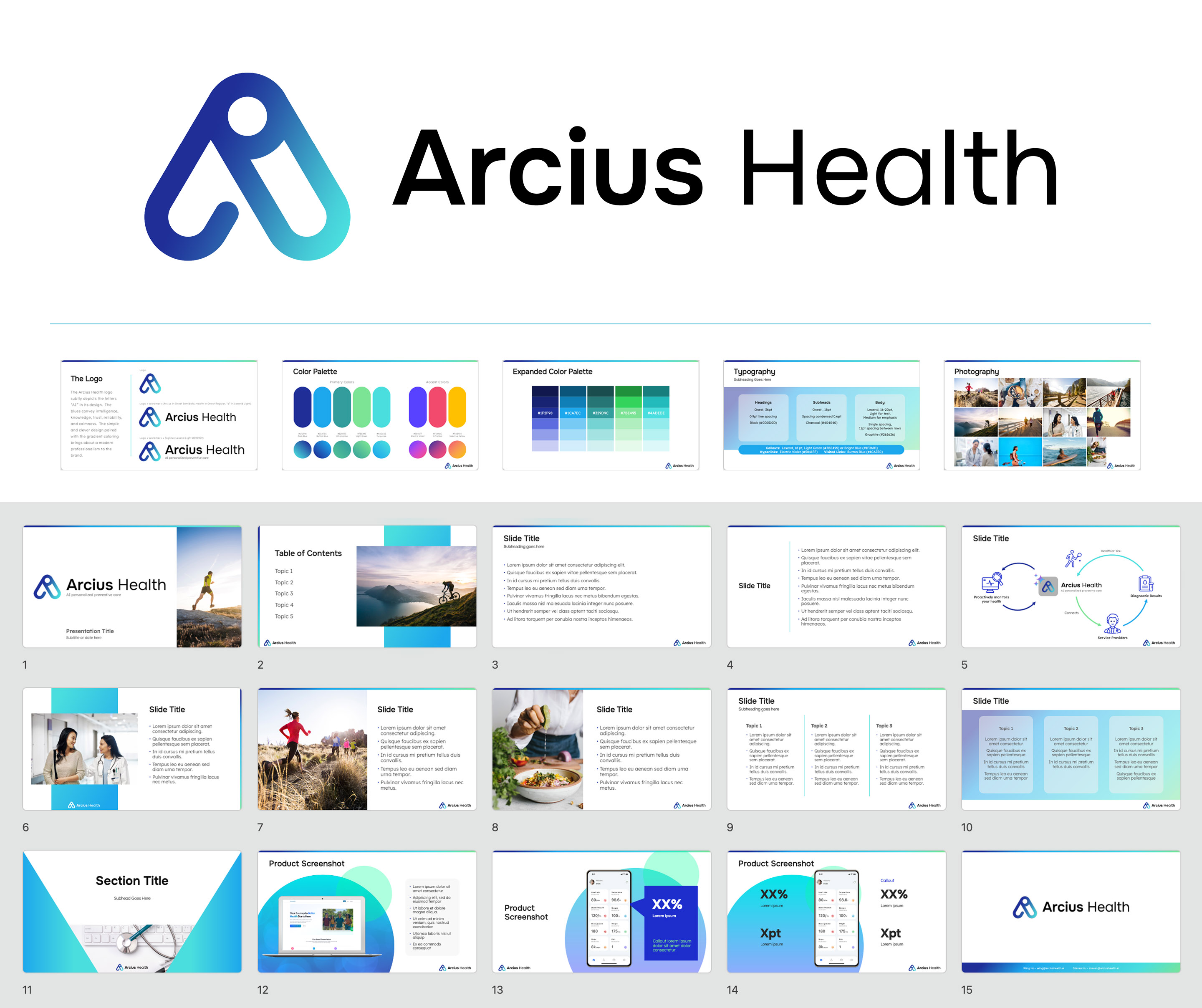 Brand development (including logo, brand guidelines, and presentation template) for a health tech startup.